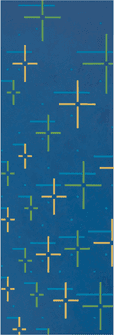 In1991 Yoshikawa began a fourth series, partly realized in parallel, cosmic webs. As a thematic strand, the “cosmic web,” however, remained among Yoshikawa’s concerns over a longer timeframe of roughly ten years. She nonetheless tackled it differently in each individual section of her oeuvre. Within the myriad series she developed, she investigated a range of differing phenomena or explored distinct manifestations of the same phenomenon. From 1990 to 1992, she continued to take the square as a starting point. In these pieces, however, the square stands on one of its sides rather than being tilted to balance on the tip of a right-angle corner. Small truncated crosses in a host of colors and with arms of varying lengths emerge on the margins of the image, their dimensions slowly diminishing, and, rather than defining a square shape in the middle of the pictorial field, instead conjure up a round form that seems “pixelated” at the edges.
