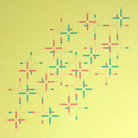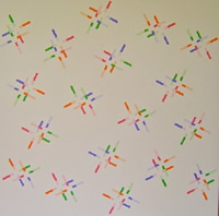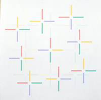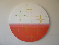 '... angesichts der neueren arbeiten spricht shizuko yoshikawa von "sternenhaften konstellationen". tatsächlich ziehen die zeichen in bahnen über die bildfläche hinweg und erinnern an sternenbilder am nächtlichen himmel über der seidenstrasse - "my silk road". das bildnerische grundelement ist kreuzförmig, aber kein christliches symbol, ist doch der kreuzungspunkt des waag- und senkrechten balkens ausgespaart. ünerhaupt kommt dem thema der leere eine immer wichtigere bedeutung zu, ja wird zu einem konstitutiven bestandteil der gestaltung. shizuko yoshikawa sieht in den "sternen" den "lebenspuls" versinnbildlicht: sie stehen für fliessen, bewegen, atmen, kommen und gehen, sie stehen im übertragenen und fernöstlich-buddhistischen sinn für gelassenheit, heiterkeit und geistigkeit...', aus ausstellungskatalog 'shizuko yoshikawa, matias spescha', museum bickel, walenstadt, 2006ab 2008 'puls'