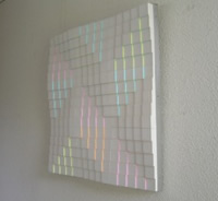 paul weder, zürich: '... konkrete kunst in einer besonderen individuellen brechung zeigt...das auge sieht sie nur im streif- oder schräglicht, und weil diese bemalten streifen auf das weiss der umgebung farbige schatten werfen, ergeben sich wirkungen von zauberhafter zartheit; es sind also die subtilen und immateriellen gitter, welche die relieflandschaft struktieren.', 03.05.77, NZZ